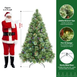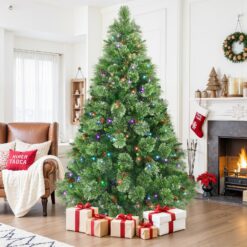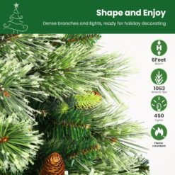 - 🎄【Ideal Size】2025 upgraded version, 6 feet tall, 1063 branch tips (including PVC tips, PE tips and pine needle tips). Pre lit Christmas Tree is 6 feet, an ideal choice for Christmas decorations. The tree comes with pine cone decoration, you can also decorate different areas of your home, office, or even a holiday party by customizing your tree with garland, ornaments, and more!