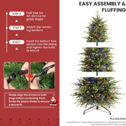 - 【Tool-Free Assembly & Compact Storage】 The pre-lit Christmas tree 7.5 foot comes in three hinged sections for quick setup and takedown. Its sturdy folding steel base attaches securely without tools, making storage convenient and hassle-free.